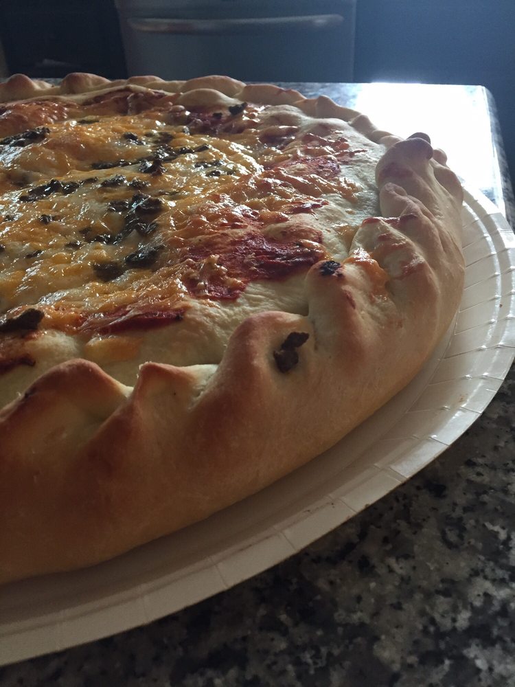 Our Original Crust topped with Traditional Red Sauce, Whole-Milk Mozzarella, Premium Pepperoni, Italian Sausage, Sliced Mushrooms, Black Olives, Cheddar, and Herb & Cheese Blend