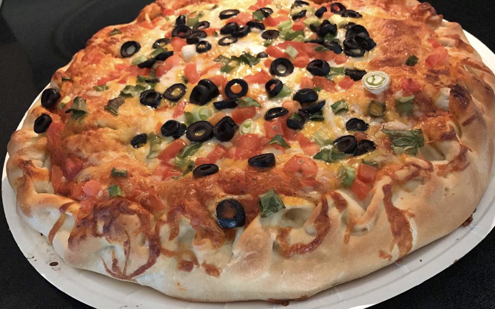Two layers of our Original Crust stuffed with Traditional Red Sauce, Whole-Milk Mozzarella, Salami, Premium Pepperoni, Italian Sausage, Ground Beef, Mixed Onions and topped with Traditional Red Sauce, Green Onions, Roma Tomatoes, Mozzarella and Mild Cheddar