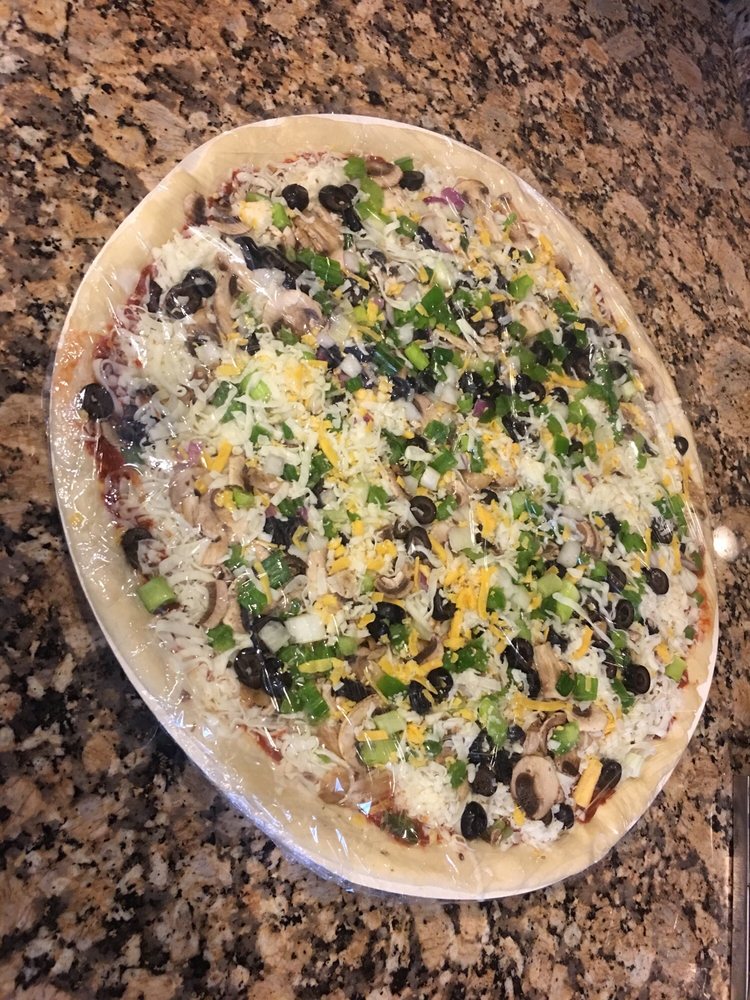 Our Original Crust topped with Traditional Red Sauce, Dairy Free Mozzarella, Sliced Mushrooms, Black Olives, Mixed Onions, Green Peppers, Roma Tomatoes